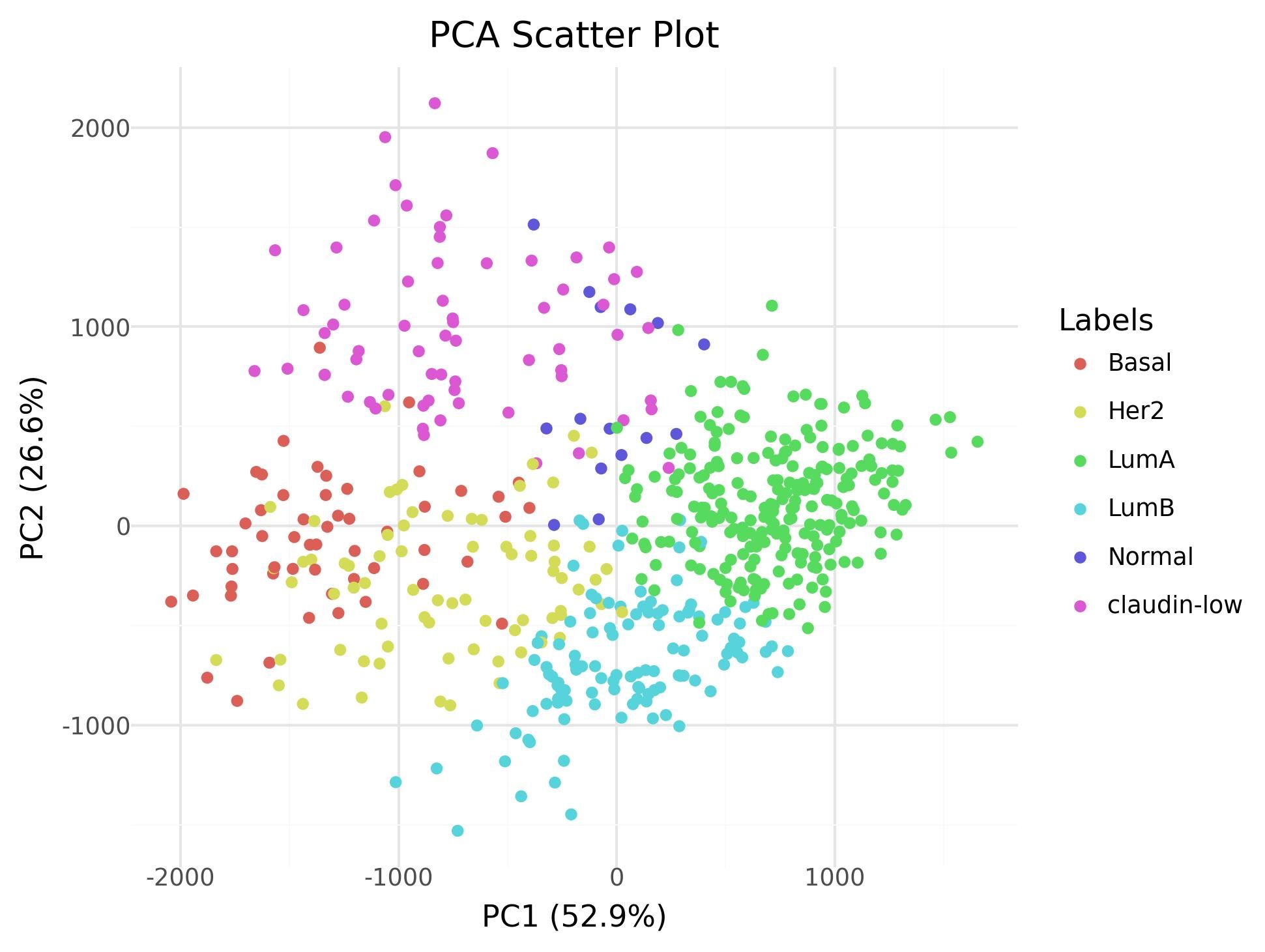 Clinical data (CLIN): Contains patient metadata including demographics, treatment history, tumor characteristics, and importantly for this tutorial, the breast cancer molecular subtypes (such as Luminal A, Luminal B, HER2-enriched, and Basal-like) subtypes based on the expression patterns of key biomarkers including claudin proteins, which are important for cell adhesion and tumor behavior.